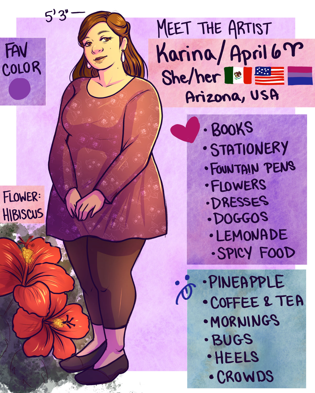 Actualmente resido en Tucson, Arizona, y soy ilustradora y artista independiente, especializada en arte de personajes y cómics. Trabajo con medios digitales y tradicionales (acuarela y pluma/tinta). Suelo centrarme en mujeres, personajes LGBTQ+ y personas de color. Mi objetivo es mostrar representación, belleza y narrativa en cada obra.