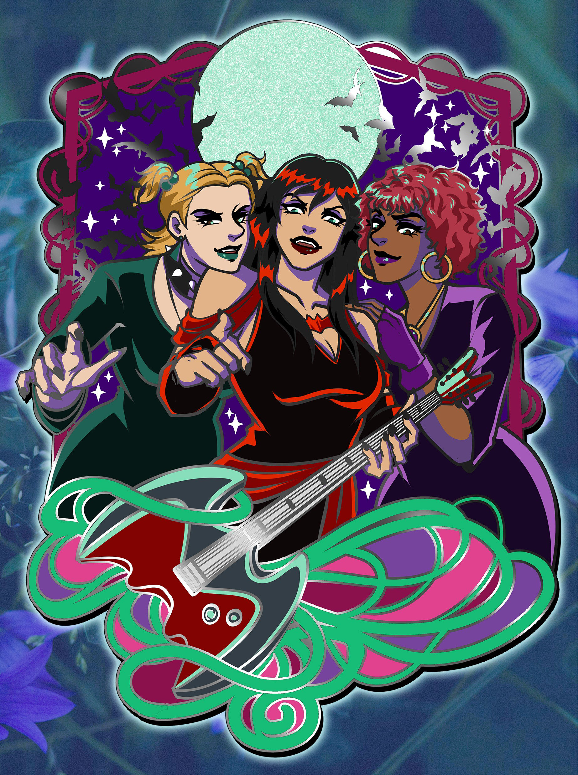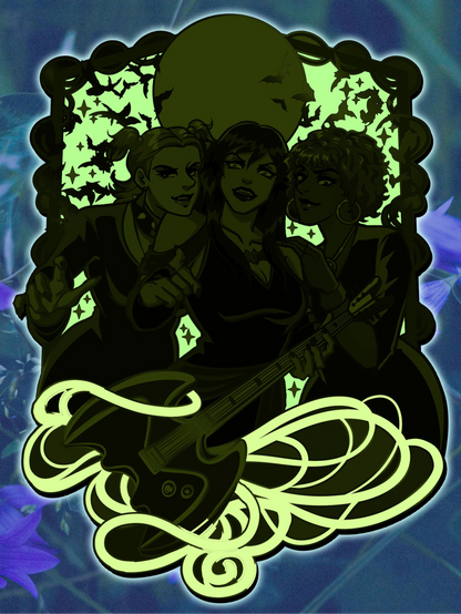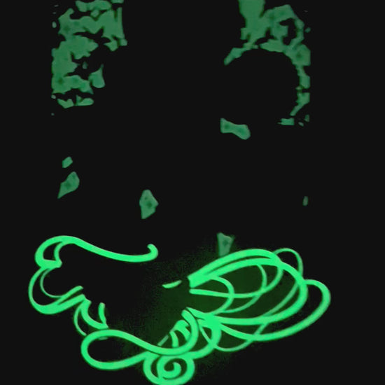3.5 inch (in height) hard enamel pin with silver plating. The pin is hard enamel with some glitter elements and glow in the dark! Black rubber pin backs (2 on the back) with a logo back stamp.