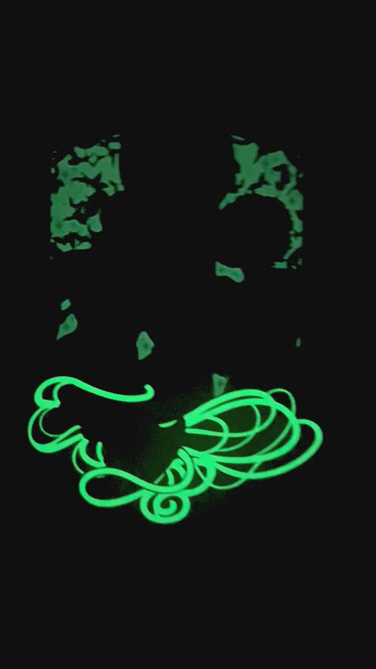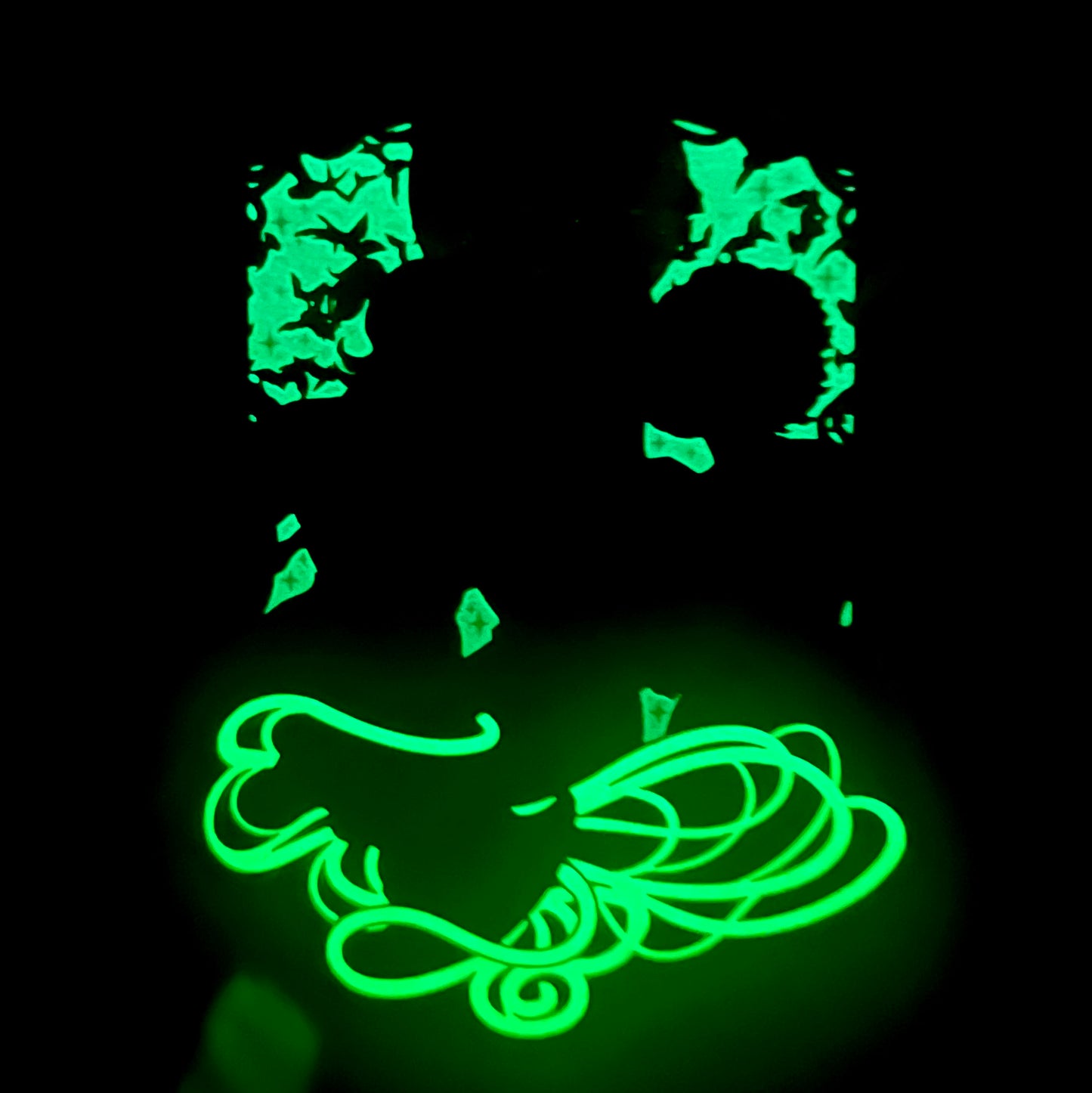The glow in the dark elements are the bright green areas and the purple background.