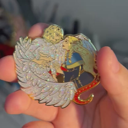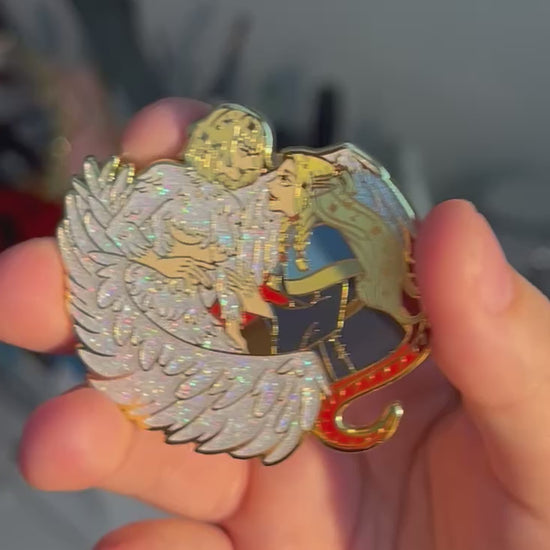 2 inch (in height) hard enamel pin with gold plating. Black rubber pin backs (2 on the back) with a logo back stamp. There are holographic glitter elements in the enamel.